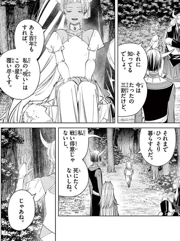 帰還の魔法を見つけたフリーレンですが、そのフリーレンから未来の情報を奪い、この時代で始末するように魔王から命令を受けた大魔族四人が、女神の石碑の前に集結していました。奇跡のグラオザームは、未来のフリーレンから記憶を奪い始末しようとやる気ですが、終極の聖女トートはやる気がなく、馬鹿馬鹿しいと言うと勝手に帰ってしまいます。ソリテールはフリーレンを襲う事には協力するようですが、援護だけで素顔は晒さないと言います。