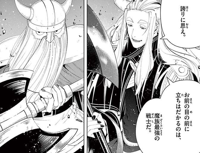 そして、女神の石碑を目指して移動しているヒンメル一行を、大魔族三人が強襲します。まずは、血塗られし軍神リヴァーレがアイゼンに奇襲し、さらにソリテールが剣のような武器を出しヒンメル達を牽制します