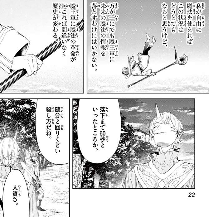 ツォルトの魔法によって空に空間転移させられたフリーレンは、未来の魔法を使って空を飛行しようか迷います。しかし万が一にでも魔王軍に未来の魔法の情報が渡れば、魔王軍に魔法の革命が起こり、間違いなく歴史が変わると考え、フリーレンは未来の魔法を使用するのを止めます。一方、ツォルトはフリーレンを人質だと言い、ヒンメル達に武器を捨てるように言います。