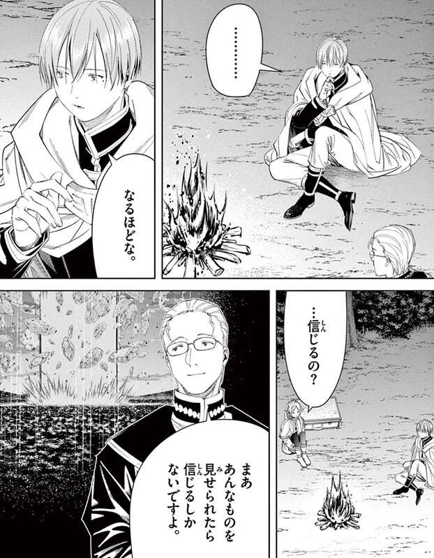 過去に戻ってしまったフリーレンは、もう一度石碑に触れれば何か起こるかもと思い女神の石碑に触れてみますが、何も起こりません。事情を知らないヒンメルはフリーレンに、女神の石碑の解析を止めて街道に戻ろうと呼びかけます。いつまでも女神の石碑の場所にいても仕方がないので、フリーレンはヒンメル達と一緒に移動しますが、フリーレンはどうすれば帰還できるか悩みます。
