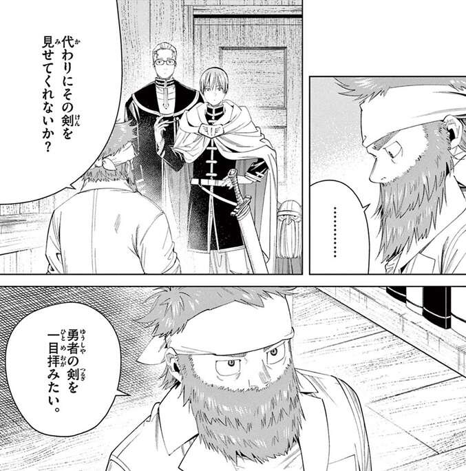 皇獄竜を倒し遺跡の聖堂を調べますが、ここでも何も見つかりませんでした。次の集落に向かい情報収集をしますが、ここは開拓されたばかりの歴史の浅い村のようで、女神の石碑の伝承などはないと村人に言われてしまいます。しかし、村で鍛冶屋をやっているキーゼルという男は、ドワーフで百年以上生きているそうです。何か知っているかもしれない、という事でキーゼルに会いに行くと、キーゼルはヒンメルに勇者の剣を一目拝みたいと言ってきます。