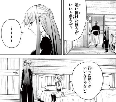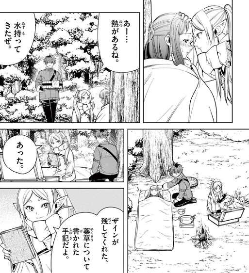 フリーレンの後押しもあり、ザインはゴリラを追って一人テューアにへと旅立ちます。フリーレン達は再び、三人となり旅を続けますが、北側諸国、オッフェン群峰で野営をしているとフェルンが熱を出して寝込んでしまいます。病気の判別をフリーレンが魔法でしようとしますが、病気の判別は女神様の魔法で聖典の所持者しか使えない事をシュタルクが指摘します。すると、私だって聖典くらい持っているよ、とフリーレンは言い聖典を取り出します。しかし、フリーレンの聖典は鍋敷きとして使用されていて、シュタルクは不安に思います。