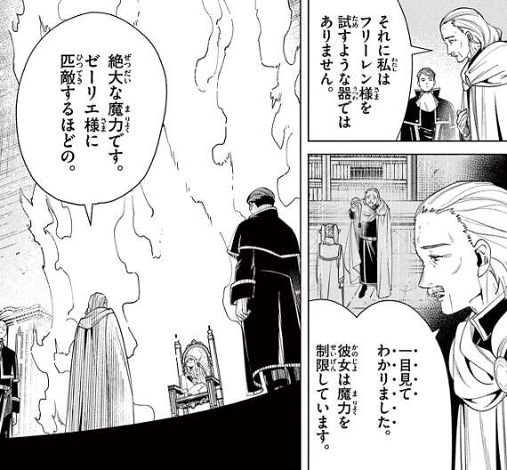 1級魔法使い試験の第三試験が始まるはずでしたが、大陸魔法協会にはフランメの師匠・ゼーリエが出向いていました。ゼーリエは第二試験の合格者が12名と多すぎると言い、異例には異例を、第三試験は私が担当する、平和的に選別してやる、とゼーリエは言い出します。従来の担当だったレルネンに異論はないかゼーリエが聞くと、私はフリーレンを試す器にないので構わない、とレルネンは返事をします。