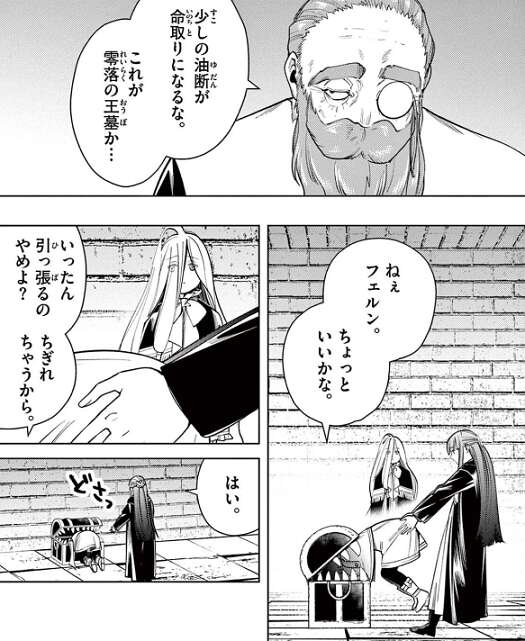 零落の王墓に潜ったデンケン達ですが、多数の罠がさっそく作動し一人閉じ込められてしまいます。結局、閉じ込められたレンゲは脱出用のゴーレムを使って迷宮を脱出しますが、脱落となってしまいます。一方、魔導書に目がくらんでミミックの罠にはまってしまったフリーレンは、フェルンに引っ張ってもらいますがなかなか抜け出せません。