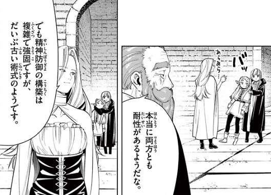 水鏡の悪魔(シユピーゲル)は、フリーレンの複製体も作り出します。実力も魔力も技術も完璧に模倣されたフリーレンの複製体が迷宮の最深部の手前の扉の前にいるため、受験生の誰も最深部まで辿り着けないでいます。格上の魔法使いを倒すとしたら、拘束魔法か、精神操作魔法だ、とリヒターは言いますが、フリーレンにはどちらの魔法にも耐性があり通用しません。