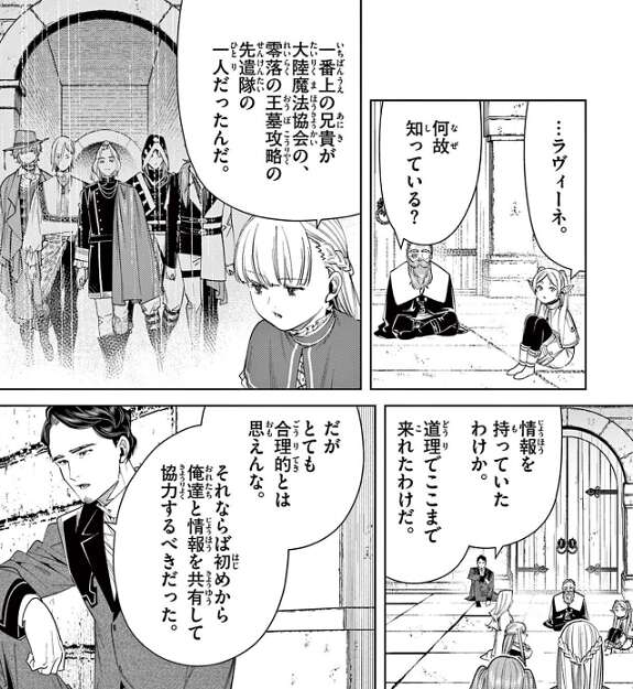 フリーレン達が集まって作戦会議をしていると、ゼンゼの複製体に襲われていたドゥンストが扉の前の部屋に辿り着きます。ドゥンストの情報を元に作戦を考えていると、ラヴィーネとカンネも扉の前の部屋に辿り着き合流します。ラヴィーネの情報も入手し水鏡の悪魔(シユピーゲル)を倒すための作戦を全員で考えていると、フェルンはある考えを思いつきます。