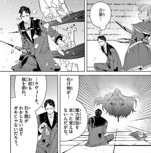 フェルンの一般攻撃魔法(ゾルトラーク)はフリーレンの複製体に直撃しますが、フリーレンの複製体は魔法で防御します。フリーレンの複製体は隙を見せず、フェルンは決定打を与えられません。一方、他の複製体を相手にしていたラヴィーネとリヒターは、ゼンゼの複製体の奇襲を受けて重傷を負ってしまいます。やむを得ずラヴィーネとリヒターは、脱出用のゴーレムで迷宮の外に脱出します。