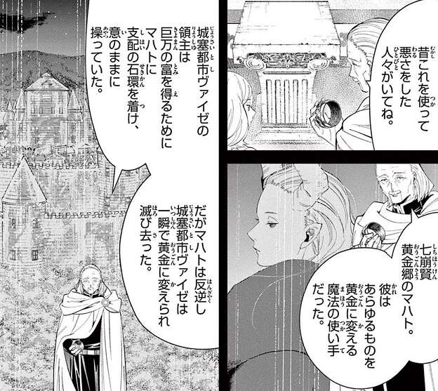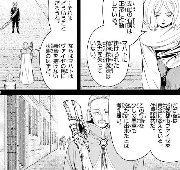 事前調査のため、黄金郷内部に入っていた数名の魔法使いは既にマハトによって殺されるか、黄金に変えられていました。それでもレルネンとエーデルは黄金郷へと入り、城塞都市ヴァイゼの生き残りの一人からマハトに関する記憶を手に入れます。その記憶の中では、マハトは領主から支配の石環を着けられ、ヴァイゼの民に悪意を抱くなと命令されていました。