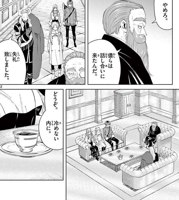 エーデルから受け取った調査記録の情報を、フリーレン達に説明し終えたデンケンは、マハトとの話し合いへと向かいます。デンケンは黄金郷に来てから毎日、マハトと話し合いを続けていて、それを聞いたフリーレンは話し合いに同行することにします。黄金郷に着いたデンケンとフリーレン達はマハトに丁重に迎えられますが、フリーレンは何故かマハトを挑発して戦闘を誘うような素振りを見せます。