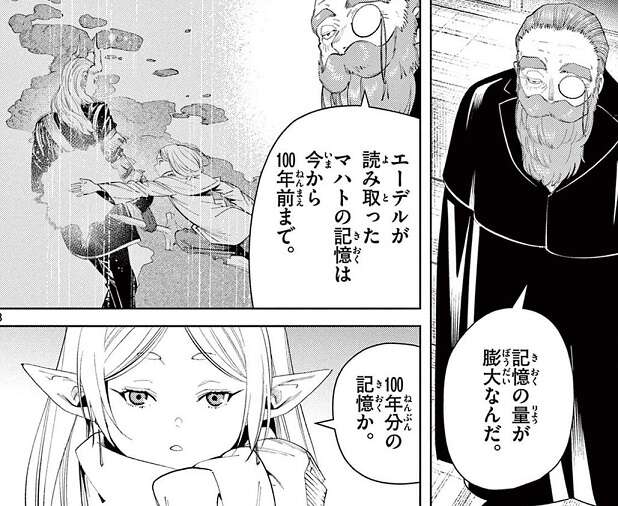 マハトとの話し合いは結局成果がなく終わり、デンケンとフリーレンはエーデルがマハトから読み取った記憶の解析を始めます。しかし、エーデルがマハトから読み取った記憶は100年分もあり、デンケンとフリーレンが協力しても解析には時間はかなりかかりそうです。