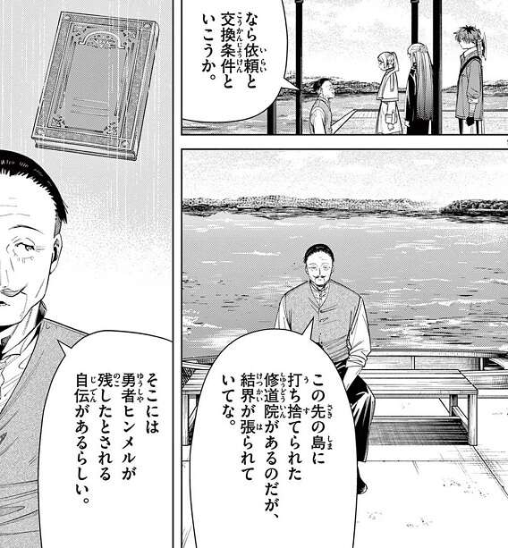 勇者ヒンメルの死から30年後、フリーレン達は北部高原のコリドーア湖を渡ろうとしますが、嵐によって足止めをくらってしまいます。嵐で船を出せず、飛行魔法で対岸まで飛ぶことも強風で難しく、港町で数か月滞在し嵐が過ぎるのを待つことにします。嵐が過ぎた後、船を出してもらおうと交渉しますが、港町で滞在している間にフリーレンが魔導書を買い過ぎて散財したため、フリーレン達は船代を出すことが出来ません。