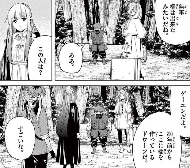 勇者ヒンメルの死から30年後、三千メートルの大絶壁のトーア大渓谷を渡ろうとするフリーレンは、渓谷にかかる橋でゲーエンというドワーフと再会します。ゲーエンは200年前からこの渓谷で橋を作っていて、橋は既に完成していましたが大型の鳥の魔物が起こす強風のせいで橋が使い物にならず困っていました。フリーレンは、“パンケーキを上手にひっくり返す魔法”を報酬として、大型の鳥の魔物を退治する依頼を引き受けます。