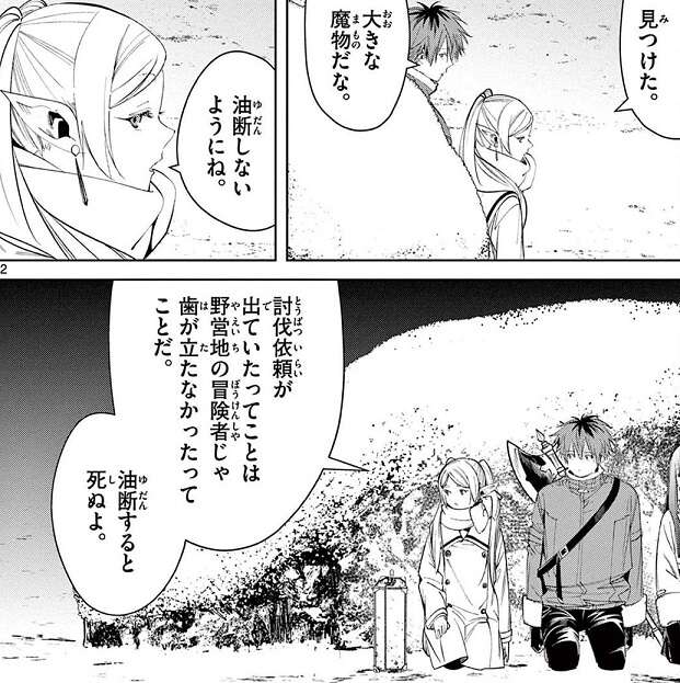 勇者ヒンメルの死から30年後、北部高原のシュマール雪原を歩いているフリーレン一行ですが、路銀が残りわずかとなり、冒険者の野営地に寄り道してそこで路銀を稼ぐことにします。野営地では聖雪結晶という貴重な魔法薬の原料がある鉱脈に、大きな魔物が巣くっていて、その魔物を討伐して欲しいという依頼を受けます。