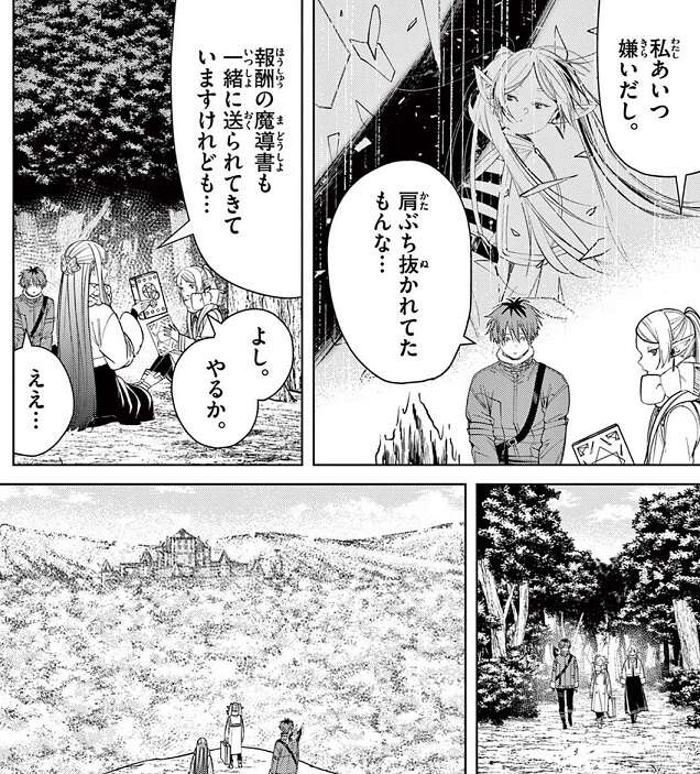 勇者ヒンメルの死から30年後、北部高原のヴァイゼ地方でフリーレン達が野営をしていると依頼の郵便が届きます。一級魔法使い レルネンからの個人的な依頼ですが、フリーレンはレルネンが嫌いなので、断ろうと考えます。しかし、フリーレンは報酬の魔導書に釣られてしまい結局、依頼を引き受けてしまいます。