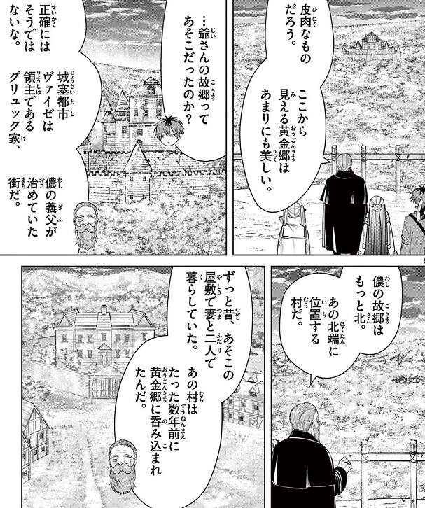 デンケンの故郷は黄金郷のマハトによって黄金に変えられており、フリーレン達はデンケンに協力して、黄金郷を元に戻そうとします。しかし、マハトの万物を黄金に変える魔法(デイーアゴルゼ)はマハトを倒しても、死後も残り続けるため、マハトの記憶を探って手掛かりを見つけようとします。