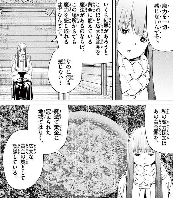 フリーレンはデンケンに協力する事に決め、結界の管理者の小屋へと向かいますが、フェルンは黄金郷を見てからずっと気分がすぐれません。黄金郷は魔法で黄金に変えられたにもかかわらず魔力を一切感じず、魔法使いのフェルンには気持ちが悪いものでした。黄金郷にかけられた魔法は、マハトの魔法、万物を黄金に変える魔法(デイーアゴルゼ)で、あらゆるものを黄金に変える“呪い”です。
