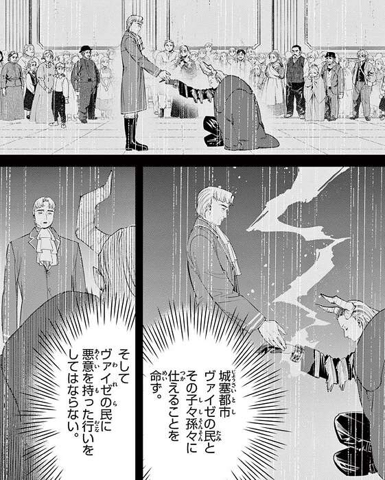 フリーレン達が依頼書にあった城塞都市ヴァイゼに行ってみると、そこには一級魔法使い試験で出会ったデンケンがいました。城塞都市ヴァイゼは50年前、黄金郷のマハトの手によって一瞬で黄金に変えられてしまっていました。デンケンは黄金郷を覆う結界の管理者となっていて、黄金郷のマハトと戦うつもりでいました。
