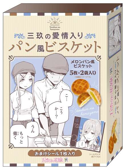 三玖が作中で作っていたパンをイメージした、メロンパン風ビスケットです。さらに約7 x 7cmのシールが1枚、おまけでついてます。