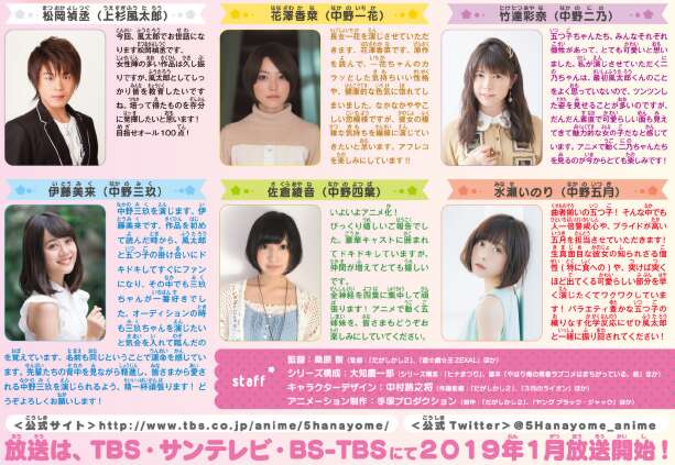TVアニメ『五等分の花嫁』1/10より放送開始です🌸🌸🌸🌸🌸#五等分の花嫁 pic.twitter.com/VyO7HzbmUB— TVアニメ『五等分の花嫁』公式 (@5Hanayome_anime) 2018年12月7日