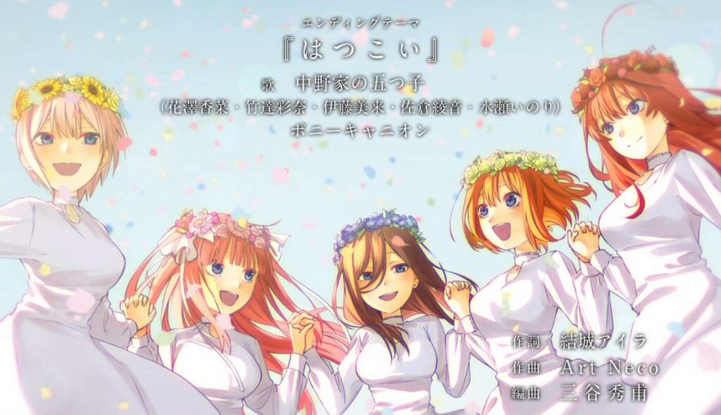 早いところだと、1月7日から待望の2期 五等分の花嫁∬、放送が開始されました。最初は京都の回想シーンから始まり、普通にOPから始まっています。OPテーマは「五等分のカタチ」です。