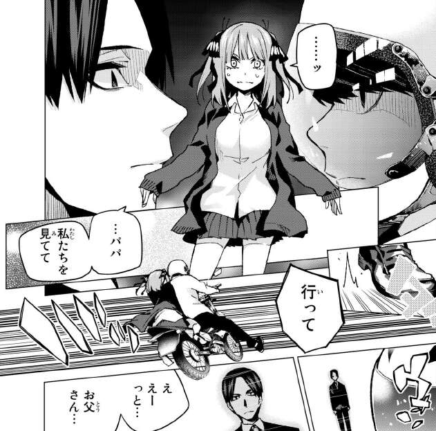 五つ子たちと風太郎の高校生活、最後のイベント 学園祭でのエピソードです。五月の前に、五つ子たちの実父が現れ、母親のような先生になりたいという五月の夢を否定します。しかし、最後は中野家全員で五月を応援する回です。五月は結局、この回でも風太郎への恋愛感情を