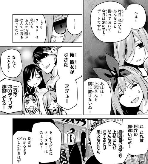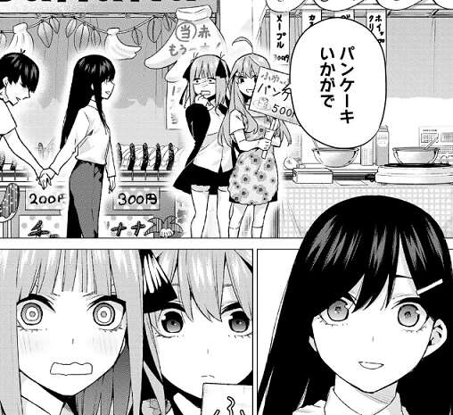さらに竹林は風太郎の手を握って走り始めますが、向かった先はパンケーキの宣伝をしている二乃と五月でした。風太郎が他の女と手を逃げっている所を見て、驚く二乃と五月です。