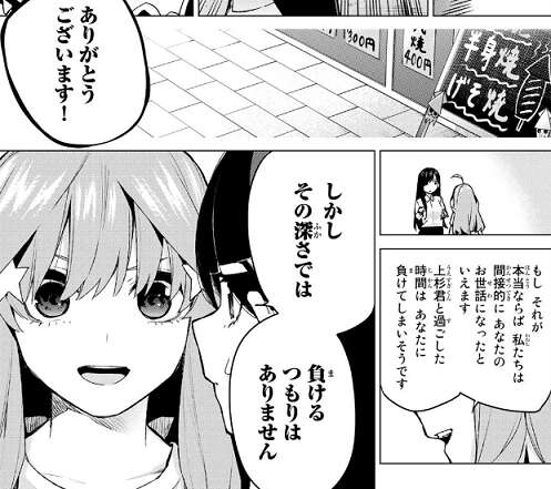 それを聞いた竹林は、自分は風太郎に勉強を教えていた事もある、二乃たちが生徒ならどちらがより親密なのかはっきりしたね、と竹林も言い返します。四葉が何か言おうとしますが、先に五月が割って入って、風太郎と過ごした時間は竹林に負けてしまいそうだが、過ごしたその深さでは負けるつもりはありません、と言います。