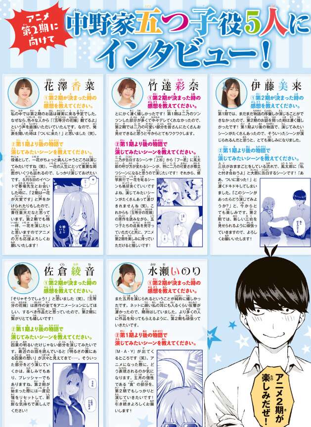 アニメ第2期に向けて、五つ子役の声優さんにインタビューを行っていて、その内容が「週刊少年マガジン」40号に掲載されています。2期に向けて、興味のある方はぜひチェックしてみて下さい。