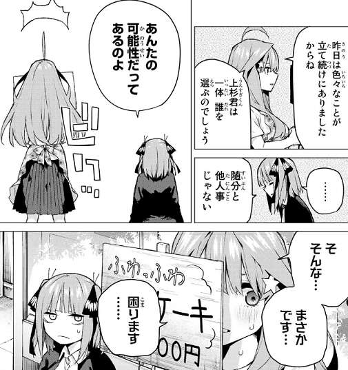 三玖は五つ子以外の別の子と一緒にいるところを見て、嫉妬しつつも風太郎が選ぶのは五人からとは言っていないと、三玖のネガティブが炸裂して、別の子を彼女に選んだ妄想をしてしまいます。