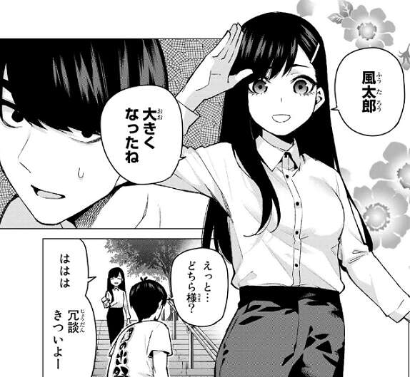 一方、風太郎は学園祭 二日目の学級長の仕事はなしになり、暇になってしまいます。急に暇になり、父親やらいはと合流でもするかと考えていると、突然話しかけてくる女性がいます。風太郎に大きくなったねと言い、生き別れの姉だとボケたりもしますが、小学生のころに比べたらお互い大きくなったよね、と言う言葉で風太郎は小学生時代の同級生、竹林だと思い出します。