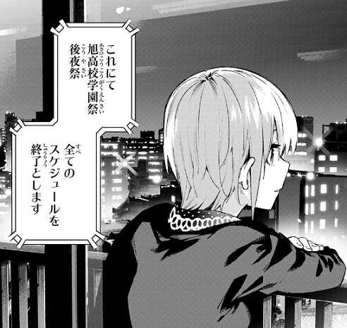 場面変わって、一花はドラマの撮影をしていて、撮影の合間に一花の携帯にメールが届きます。メールには風太郎から学園祭初日15時に教室に来てくれと、連絡が来ています。学園祭初日に五つ子と風太郎が集まり、風太郎が五人に突然告白するのですが、一花はメールを見て何の用だろ…、と変な期待をして顔を赤くしてしまいます。