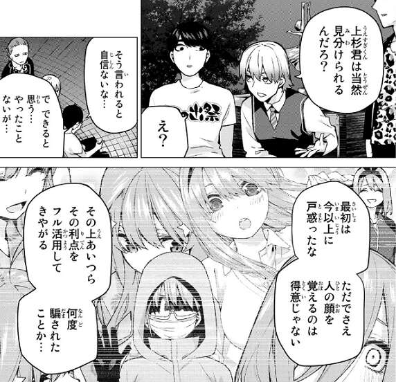 その話題から五つ子たちの話になり、武田は風太郎に五つ子たちを当然見分けられるんだろう?と質問します。風太郎は自信がないなと、できると思う…、やったことはないが、とぼかして返事をします。しかし、武田から一体、彼女たちの誰から見分けられるようになったんだいと聞かれ、前田からは五つ子の誰かを好きなのかと核心に迫る質問されます。