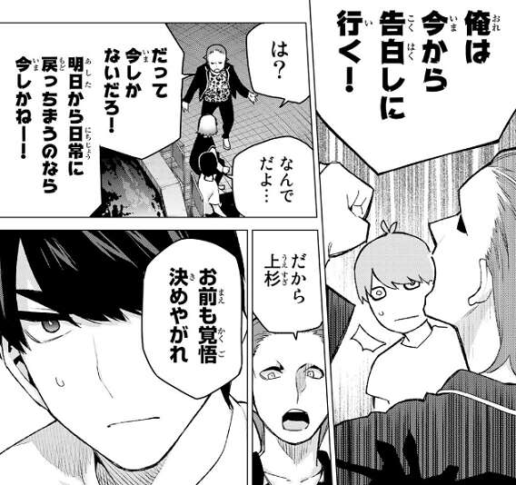 風太郎が無言のままでいると、前田が突然今から告白にしに行くと叫び、風太郎にも覚悟を決めるように迫ります。しかし、武田から学生の本分は学業にあると、告白を否定するようなセリフが出てきます。