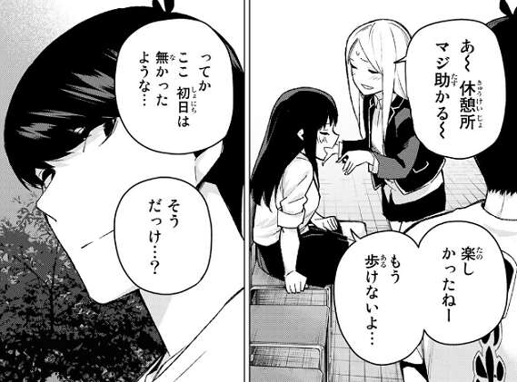 学園祭が終わる寂しさを感じながら、せっかくだからいつまでもこんなところに座っていないで屋台に食いに行こうと前田が言うと、風太郎も行けずじまいの店があったと賛成します。そして、それが終わったら俺は会う約束をしている奴がいると言います。