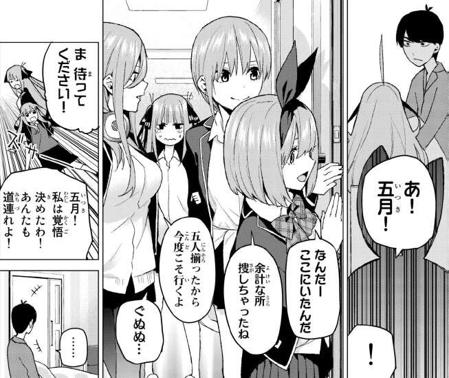 ここで一花、三玖、四葉が部屋に戻ってきて、五月を予防接種に連れて行きます。先週、二乃と五月は予防接種が怖くて3人と別行動でした。連れ去られる五月です。