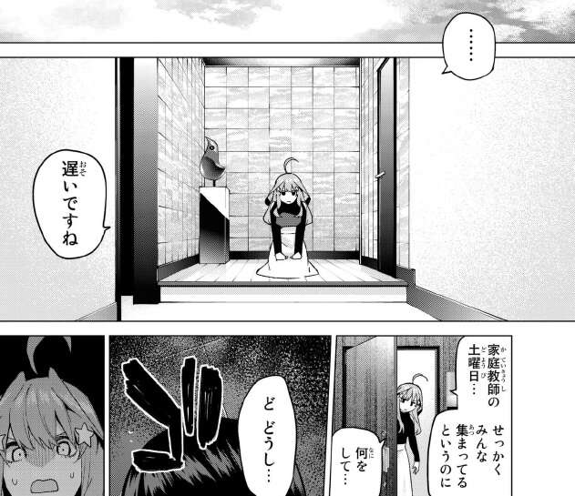 せっかくの家庭教師の土曜日の日に、五月は風太郎を待っていますがなかなか来ません。五月が玄関を確認すると、風太郎が倒れています。死んでいる?