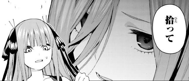 怒っているようにみえる三玖は、払った問題集を拾うように二乃に迫ります。怖いです、三玖。