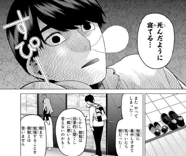 風太郎に何かあったかと五月は焦りますが、ただ単に寝ているだけでした。徹夜で今回の試験の、全ての範囲をカバーした想定問題集を用意したようです。これにはドン引きする五月で、家庭教師の約束をなしにして欲しいと言い出すほどです。