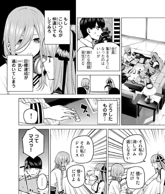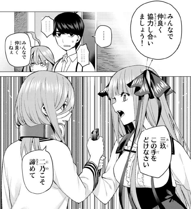 みんなで仲良く協力し合いましょうと言う五月ですが、早速二乃と三玖が言い争いを始めます。