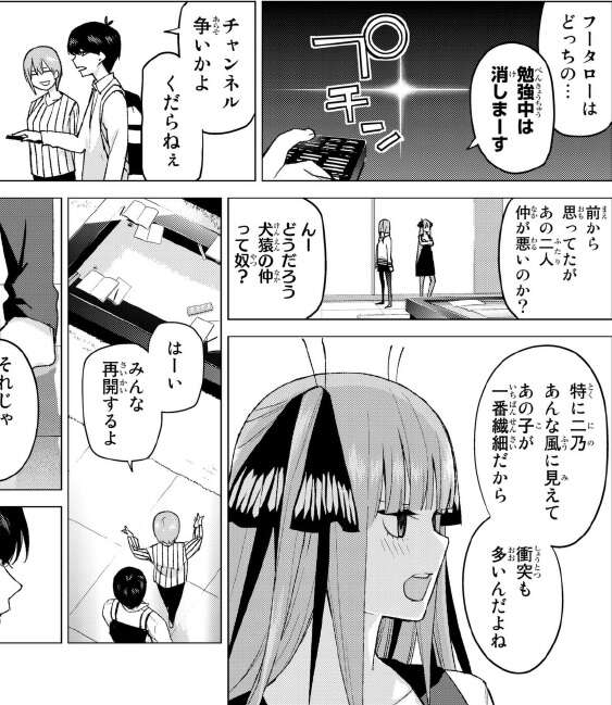 やっている事は勉強の事かと思いましたが、テレビのチャンネル争いでした。二乃と三玖は犬猿の仲らしいですが、二乃は五つ子の中で一番繊細で他の四人とも、衝突が多いそうです。