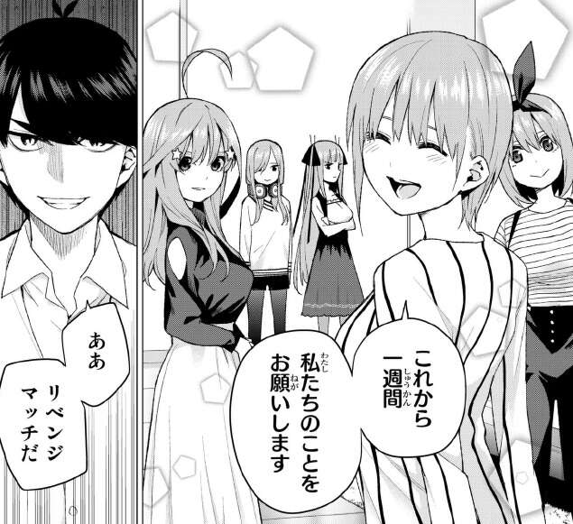 家庭教師、初日を始めましたが、二乃と三玖が仲違いをしそうです。風太郎はどうしたものかと考えますが、今にも問題が発生しそうです。問題解決のアイディアを募集すると、四葉が意見を言います。