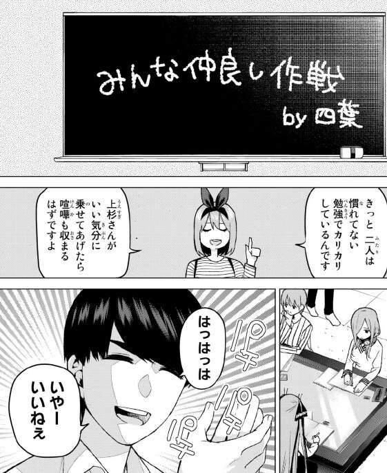 皆がカリカリしているのは、勉強になれていないからだと言います。四葉の作戦で、風太郎にいい気分に乗せるように言います。四葉曰く、2人とも慣れていない勉強でカリカリしていると。風太郎が2人を褒めてあげれば、気分も良くなるはずだと言います。