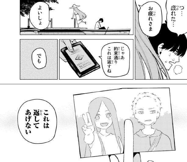 ボートを降りた後、零奈は生徒手帳を返しますが五年前に撮った写真は返してあげないと言います。零奈はもう風太郎に会えないからと言い、五年前に買っていたお守りの中身に何かした後、その代わりにとそのお守りを渡します。