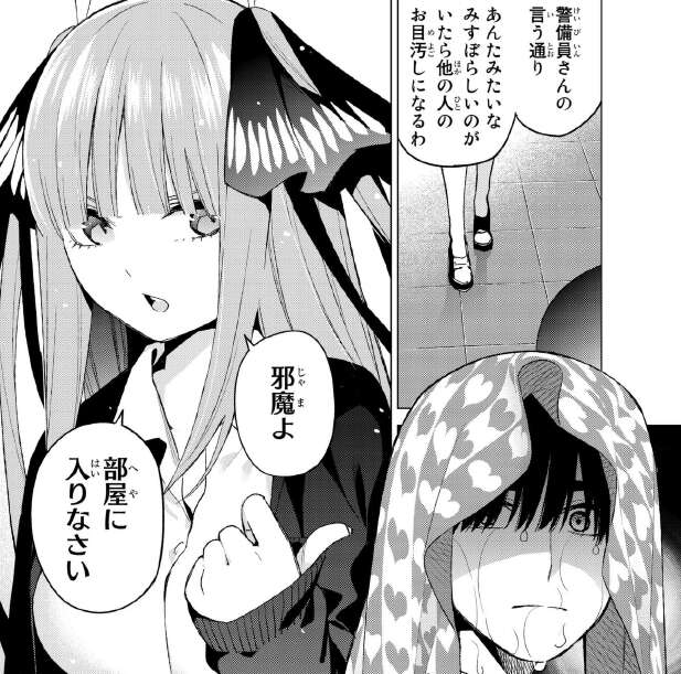 風太郎はもう一度、二乃が住んでいるホテルに行き二乃を説得しようとしますが、茫然自失状態の風太郎は警備員に注意されると、すんなりと引き下がってしまいます。
