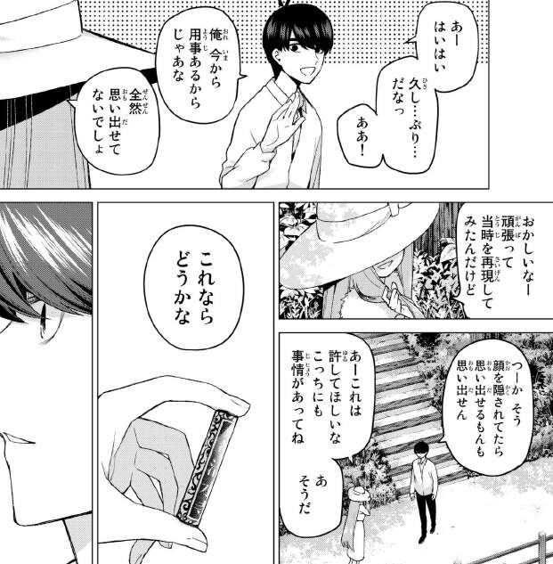 前回は五つ子の赤点を回避すべくあらためて、試験勉強をさせようとしますがことごとく失敗してしまいます。落ち込む風太郎の前に、あの写真の子が現れます。