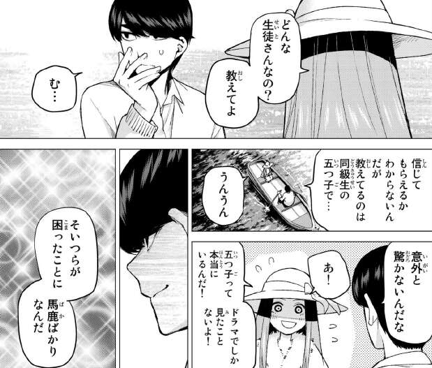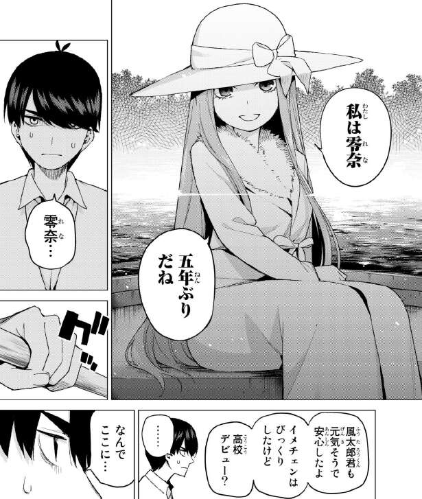 強引にボートに誘われて、ボートを漕がされる風太郎ですが、体力がない風太郎は早くもボートを漕ぐのが限界です。いまだに目の前に京都で会った女の子がいる事が信じられない風太郎。まだ名前も聞いていなかった事を思い出し、名前を聞くと「私は零奈(れな)」と言い、五年ぶりだねと語ります。さらに風太郎が勉強を頑張って学年一位でいる事、今は同級生の五つ子の家庭教師をしている事など、近況まで知っています。