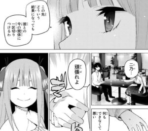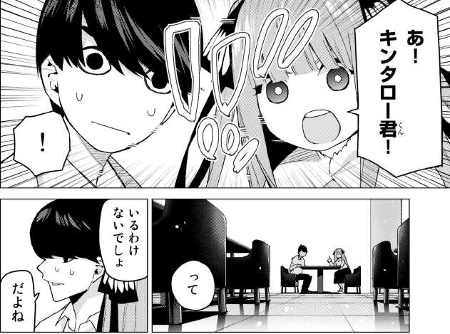 ここで二乃から一旦中断されてしまいます。戸惑いながらも、渋々従う風太郎です。そして二乃から呼び出されて1階のカフェに呼び出されます。