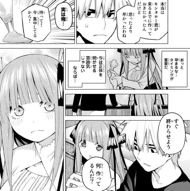 キンタロー君=風太郎なので適当に話を流そうとしますが、二乃はフェイントを入れて風太郎を驚かせます。