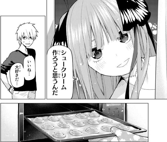 風太郎からシュークリームが好きだとアドバイスを受けると、素直にシュークリームを作る二乃です。