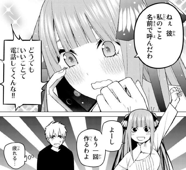 沢山作ったので、他の姉妹も呼ぼうと言いますが二乃は2人っきりを邪魔されたくないと言います。